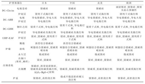 摘 要:由三根電極的普通交流電弧爐發(fā)展為超高功率(UHP)及一根電極的直流(DC)電弧爐,爐體結構有一些改變。針對各部位的損毀因素,內襯用的耐火材料也有所發(fā)展。例如普通電弧爐的爐頂用高鋁磚、爐墻鎂磚砌筑,而UHP及DC電弧爐采用大面積水冷爐頂、爐墻,爐頂三角區采用剛玉澆注料或預制件,爐墻用鎂碳磚,蝕損嚴重部位采用噴補作業。還介紹了日本等一些國家DC和UHP的各種爐型用耐火材料。煉鋼電弧爐是以電極端部和爐料之間發(fā)生的電弧為熱能進行煉鋼的設備。電弧爐以廢鋼為爐料直接煉鋼,與礦石煉鐵后再煉鋼相比,基建投資少,節(jié)能60%、節(jié)水40%、減少廢氣排放86%、減少廢渣97%[1]。交流電弧爐歷史悠久,交流電是通過三根石墨電極輸入爐內,在電極下端與金屬料之間產生電弧,利用電弧高溫直接加熱爐料,使煉鋼過程得以進行。供電功率越高,爐料熔化速度越快,降低能量消耗越多,因此出現超高功率(UHP)電弧爐。在超高功率的基礎上發(fā)展了直流(DC)電弧爐煉鋼。直流電弧爐是以一根石墨電極的端點為陰極,爐底為陽極,石墨電極位于爐膛中心部位。與UHP相比設備結構簡單,建設費用低,熔池中的電流與熱量分布比較均勻,不存在過熱區域,因此耐火材料損耗比較小、節(jié)能且噪音小等。目前,煉鋼電弧爐向大型化、控制自動化方向發(fā)展。我國的電弧爐主要用來生產合金鋼。煉鋼水平與工業發(fā)達國家相比差距較大,如2015年我國電爐鋼占粗鋼總產量的6.1%,2020年有所提高,但也不超過10%,與世界平均水平的30%相比還有較大差距。我國已經引進先進水平的UHP和DC電弧爐,隨著經濟發(fā)展,工業化程度提高,必然伴以廢鋼資源數量增加,同時發(fā)展鐵礦石直接還原煉鐵技術,代替廢鋼,增加電弧爐煉鋼的爐料,還有核電的發(fā)展,使電弧爐煉鋼有了物質保證。電弧爐的內襯是耐火材料構成的,隨著UHP和DC技術的發(fā)展,需要新型優(yōu)質耐火材料與之相配套。有人說[2]:沒有優(yōu)質爐襯、爐底耐火材料支持長壽爐齡,超高功率電弧爐就無法發(fā)揮高效生產的優(yōu)勢。爐底耐火材料是直流電弧爐得以實現的必要條件,反映了煉鋼與耐火材料技術的互相影響,互為依存,在電弧爐煉鋼系統優(yōu)化生產中有不可分割的作用。1 電弧爐的結構變化傳統的電弧爐由爐頂(又稱爐蓋)、爐墻、爐坡、爐底和出鋼槽構成,全部用耐火材料構筑,外包鋼制爐殼。爐墻一側設有爐門,另一側為出鋼口,并與出鋼槽相連。而UHP和DC電弧爐采用偏心爐底出鋼,使爐體由傾動式改為固定式,爐底有供氣攪拌設置,爐頂安裝氧-燃料燒嘴,在爐底偏心位置設置出鋼口,代替出鋼槽。由于取消了傾動設備,擴大了水冷面積,緩和了爐襯的損毀,適當降低了出鋼溫度,并縮短了出鋼時間,從而降低生產成本。爐墻采用鑲砌水冷箱式水冷套措施,其內表面噴涂一層耐火涂料,使其掛渣形成保護層,可有效降低耐火材料消耗,但電耗可能增加。國外有的電弧爐功率達1 000 kV·A/t以上,爐墻壽命達2 000爐次以上,水冷爐蓋壽命達4 000爐次,降低耐火材料消耗60%以上。2 耐火材料內襯的損毀因素電弧爐內襯的耐火材料長期處于高溫、熔渣侵蝕和急熱急冷狀態(tài)下,工作條件極其惡劣。在煉鋼的熔化期和氧化期,不致于因高溫損壞爐襯,但在還原期的鋼液溫度相當高,又受電弧直接輻射(有時溫度達4 000℃以上),爐襯很容易造成熔融損壞。出完鋼裝料時,爐襯溫度突然下降,裝完料開始送電,溫度又逐漸升高,這種急冷急熱是爐襯剝落的直接原因,主要是爐頂容易剝落。耐火材料內襯損毀的主要因素包括[3]:(1)化學侵蝕。FeO或渣中SiO2與耐火材料中的CaO、MgO之間的化學反應,使爐襯變?yōu)槿墼?,而導致損毀。(2)耐火材料內襯中的碳成分被含氧成分(如FeO、O2、MgO等)氧化,導致耐火材料脫碳而損毀。(3)沖刷和機械沖擊。鋼水或熔渣流過耐火材料表面,以物理性磨損或沖刷爐襯,而導致內襯損毀;在出鋼口、渣線、電極口或排氣口平臺等沖刷嚴重,廢鋼等爐料吊入往往撞擊爐襯而損毀。(4)水化。在生產過程中,往往會出現爐頂或爐墻漏水或滲水,還有水蒸氣,與堿性耐火材料中的MgO、CaO進行水化反應,使內襯損毀。3 電弧爐用耐火材料根據電弧爐的結構,由于各部位承受的熱負荷大小不同,與熔渣、鋼水接觸作用及機械損壞程度存在差異,不同部位必須采用不同的耐火材料[4]。3.1 爐頂(蓋)我國中小電弧爐普遍采用燒成或不燒高鋁磚,局部用高鋁質或剛玉質不定形耐火材料預制件。大型超高功率電弧爐和直流電弧爐采用水冷技術,除三角區外,爐頂耐火材料不是關鍵。三角區由于強烈熱震及電極熱輻射苛刻,國外普遍采用剛玉質或鋁鉻質搗打料,我國一般用高鋁質或剛玉質搗打料。天津鋼管集團公司150 t超高功率電弧爐,爐頂三角部分(三個電極孔周圍)采用鉻剛玉質澆注料預制件,預先烘烤,現場直接使用,并解決了電極孔定位的難題。還針對氧槍上部損毀較快問題,在該區域采取局部加厚處理,使爐頂各部分損毀速度基本一致,最高壽命達676爐次。3.2 爐墻(壁)分為一般爐墻、渣線區和臨近電弧的熱點部位爐墻。一般爐墻主要用鎂磚、白云石磚砌筑,也有用不燒鎂磚和瀝青結合的鎂質及白云石質搗打料。超高功率和直流電弧爐冶煉特殊鋼的爐壁使用鎂鉻磚和優(yōu)質鎂磚砌筑。由于渣線和熱點部位是爐墻的薄弱環(huán)